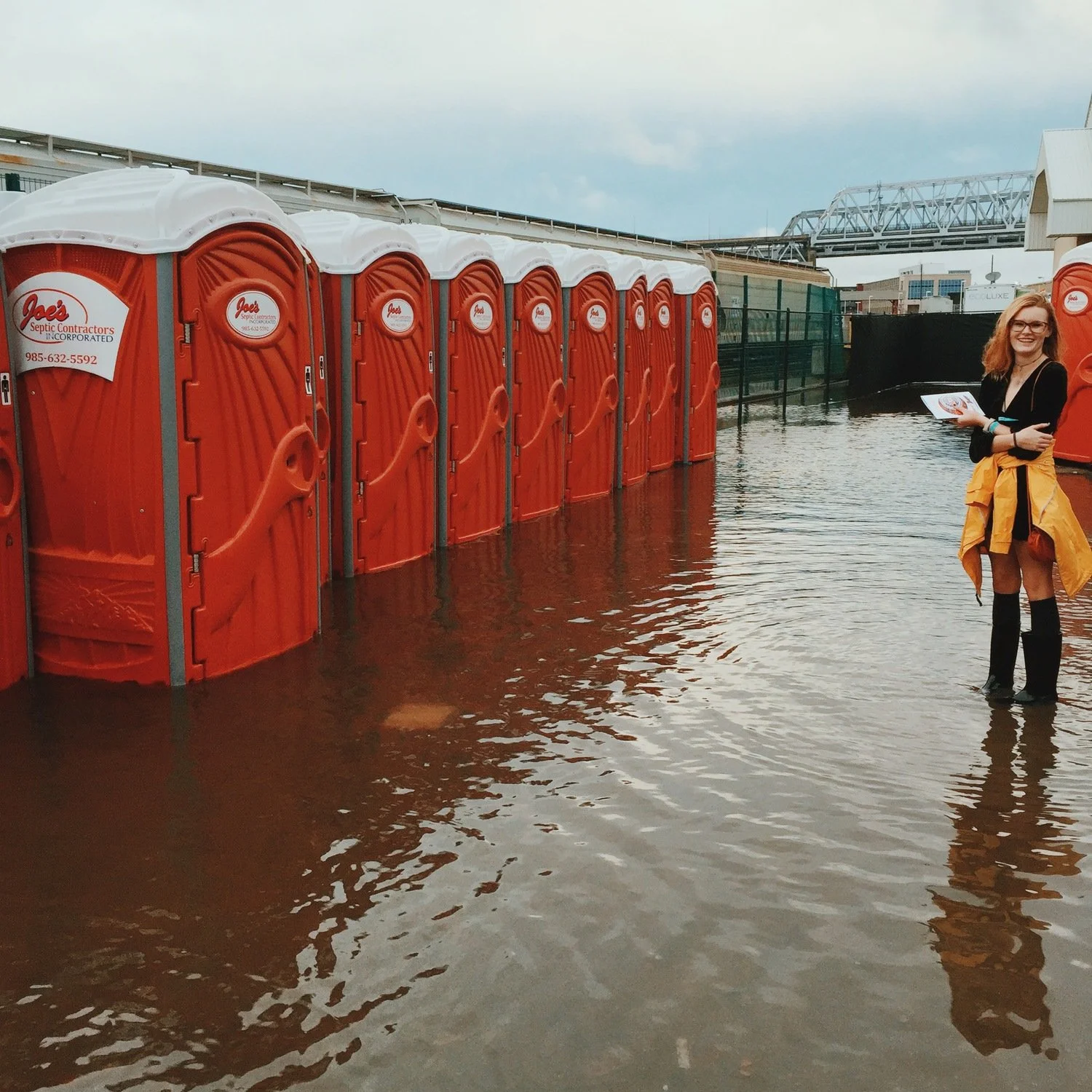 My friend Darby waiting to use a bathroom. New Orleans was pretty flooded from all the rain. This was real nasty.